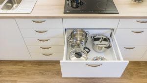 Hyvin suunniteltu laatikosto on toimivuuden kulmakivi. Lieden alle sijoitettu syvä vetolaatikko tarjoaa säilytystilaa esimerkiksi kattiloille.