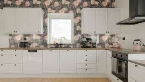 Näyttävä kukkakuositapetti yhdistettynä vaaleaan kaapistoon on harkittu yksityiskohta Mäntsälässä sijaitsevassa omakotitalossa, jonne Kolmoset teki kattavan huoneistoremontin.