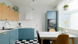 Esimerkiksi Lahden kerrostalokohteessa vaaleansiniset kaapistot ovat paitsi tyylikkäät myös lisäävät tilaan valoisuutta ja pehmeyttä. Kokonaisuuden täydentää ruutulattia. Mäntsälässä remontoidussa keittiössä persoonallisuutta keittiöön tuo puolestaan kukkakuositapetti.