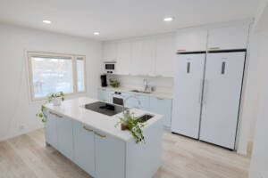 Espoon Tuurinniitynkujan kohteessa keittiön uusien ylä- ja alakaappien välinen kontrasti on tyylikäs. Lisäksi mm. kulunut parkettilattia uusittiin osana laajaa pintaremonttia.