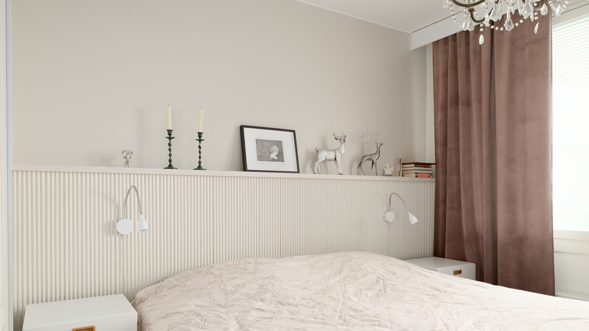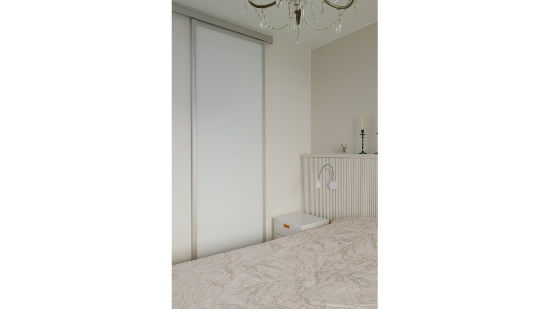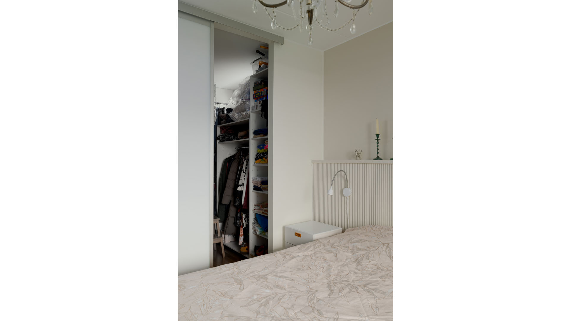 Myös muiden huoneiden sisustus mietittiin uusiksi. Asunnon alkuperäinen tammiparketti hiottiin ja lakattiin. Makuuhuoneen pinnat uusittiin kokonaan ja vaatehuoneen oven paikka vaihdettiin ahtaasta eteisestä makuuhuoneen puolelle. Oviaukkoon asennettiin tilaa säästävä liukuovi.