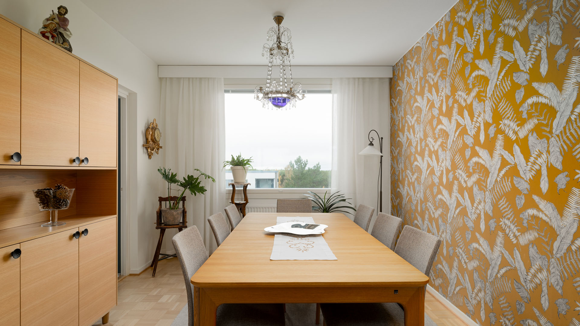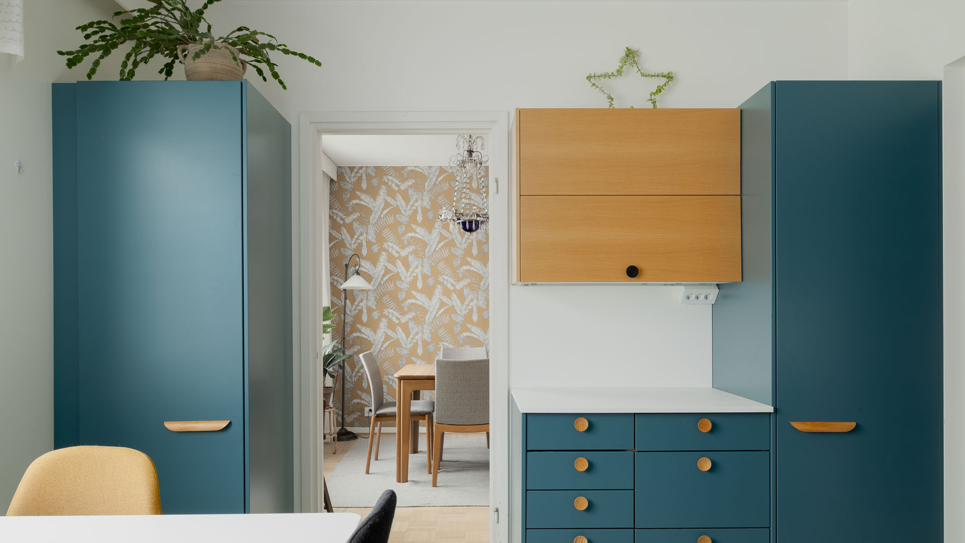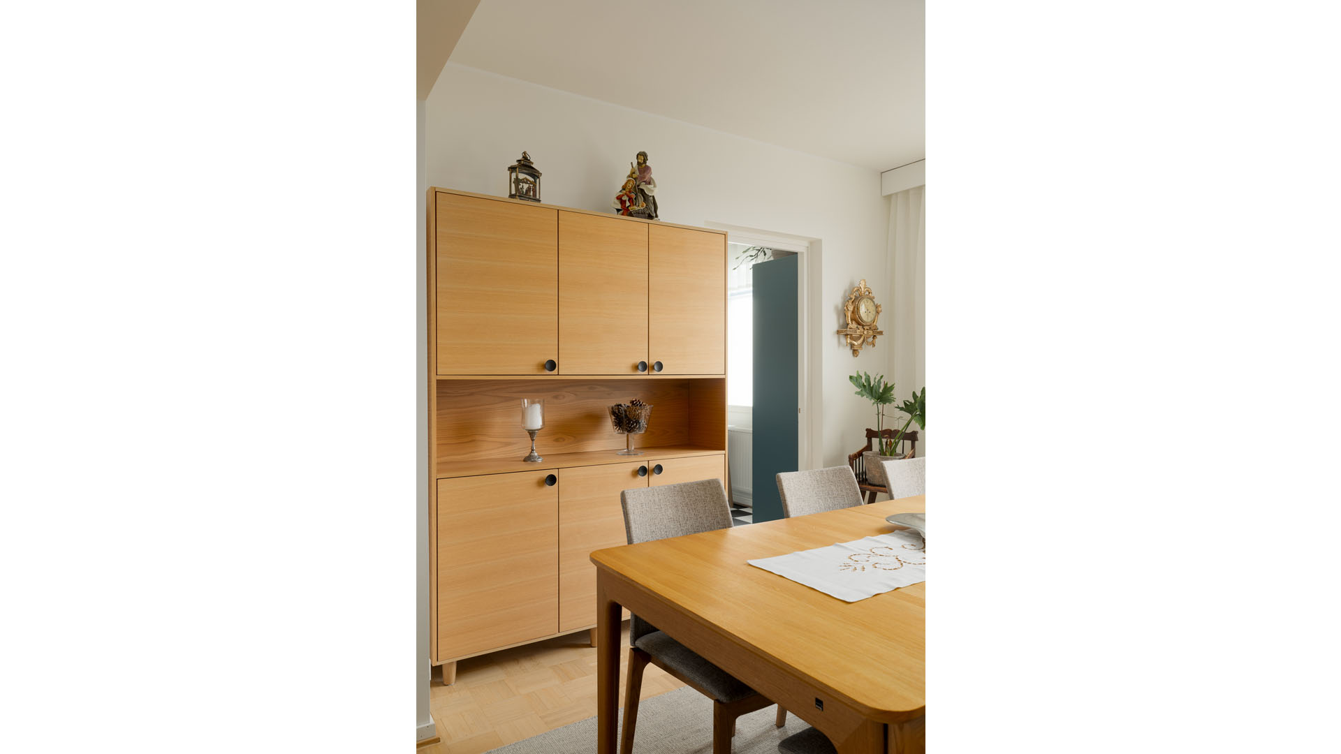 Myös muiden huoneiden sisustus mietittiin uusiksi. Asunnon alkuperäinen tammiparketti hiottiin ja lakattiin. Makuuhuoneen pinnat uusittiin kokonaan ja vaatehuoneen oven paikka vaihdettiin ahtaasta eteisestä makuuhuoneen puolelle. Oviaukkoon asennettiin tilaa säästävä liukuovi.